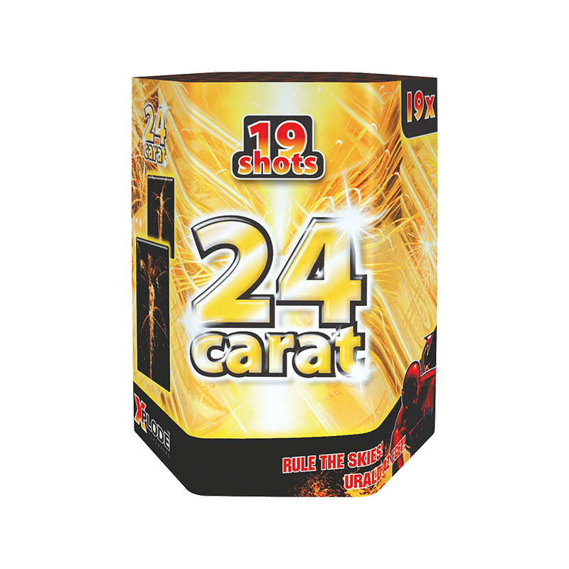 A 24 Carat tűzijáték telep 19 lövéses, 20 mm-es kaliberű, 30 másodperces aranyfényes show az Xplode-tól. Elegáns, látványos és biztonságos – tökéletes választás szilveszterre vagy lány/legénybúcsúra.