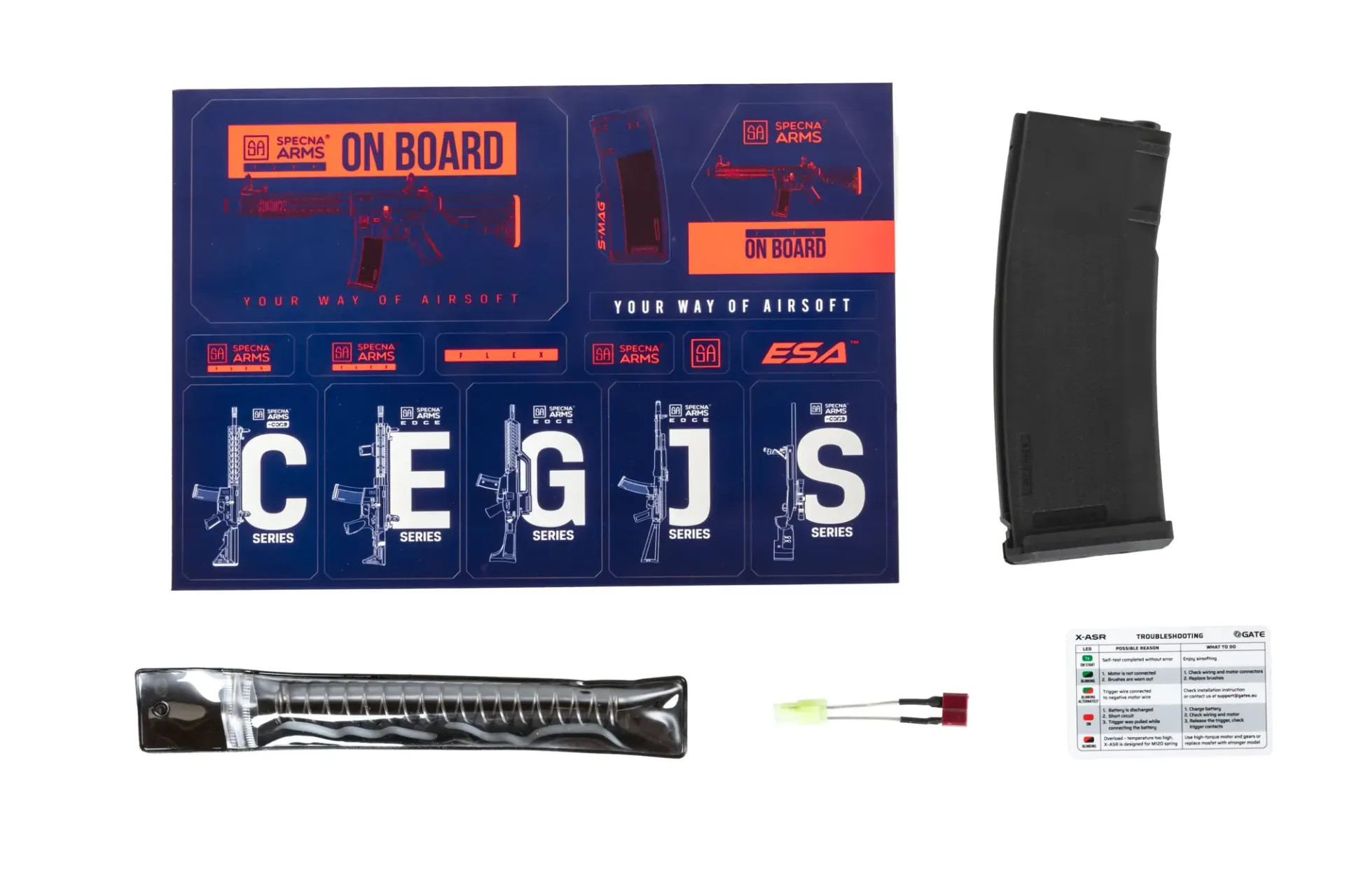 A karabélyt gyárilag telepített MOSFET X-ASR készülékkel szerelték fel a lengyel GATE márkától. Ez példátlan együttműködés egy lengyel gyártó és egy ismert airsoft fegyvergyár között. A legmagasabb minőségű MOSFET X-ASR gondoskodik a replika alkatrészeinek biztonságáról, javítja a ravasz reakcióját, valamint az elektronika és az akkumulátor élettartamát, valamint lehetővé teszi a replika belső hibáinak diagnosztizálását a beépített jelző LED-ek segítségével. A Specna Arms bemutat egy replikák sorozatát – a FLEX-et™. A vonzó ár, innovatív rugócsere rendszer és kiváló minőségű anyagok különösen vonzóvá teszik ezt a sorozatot a kezdő airsoft játékosok számára. A nejlonrost-erősítésű polimert használják a megnagyobbított SF támasz és pisztolymarkolat testén, elején, csúszdájához és akkumulátorrekeszein.